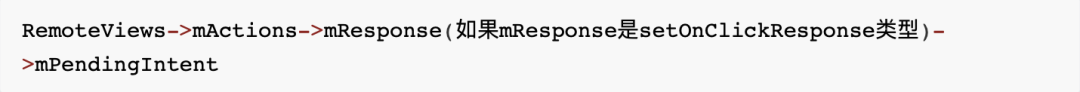 但是拿到RemoteViews以后再获取PendingIntent却颇费周折,因为RemoteViews并未提供公开API来获取其中的PendingIntent。但经过分析,我们发现可以通过反射,按照如下顺序逐次获取隐藏的成员变量mPendingIntent。