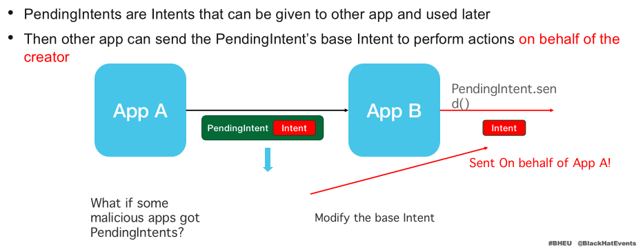 如果恶意App有能力获取上述通信过程中的PendingIntent,就可能以源App的身份和权限发送修改后的base Intent,造成非预期的安全后果,这就是PendingIntent面临的安全风险。