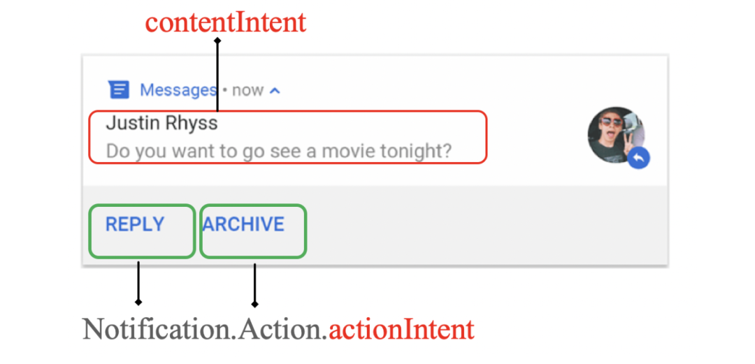 通过 setContentIntent 方法对通知设置了一个contentIntent PendingIntent,使用户在点击通知的正文时,触发PendingIntent,跳转到AlertDetails。除了contentIntent外,通知中还可以设置其他按钮,通过actionIntent进行设置,下面的通知示例表明了通知中的各种PendingIntent。另外,通知还可能包括另外一个deleteIntent PendingIntent,在被用户删除通知时触发。