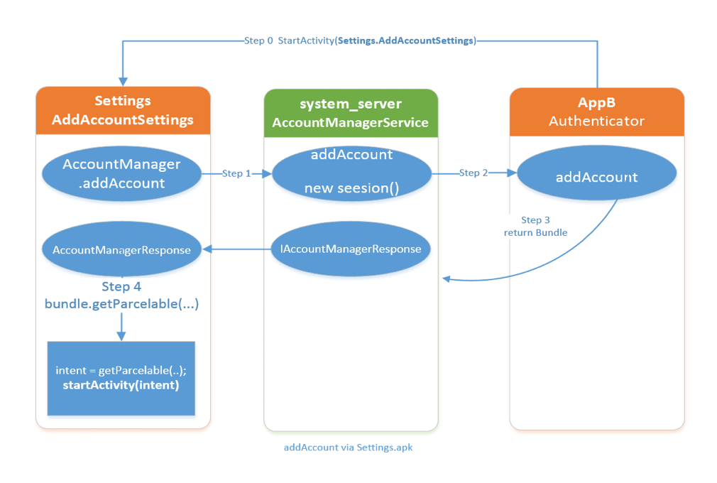 以往的研究涉及的实际漏洞案例不多,一个著名的例子是Android系统AccountManagerService中的BroadcastAnyWhere漏洞,涉及到Settings App、System Server与Authenticator App的复杂交互。