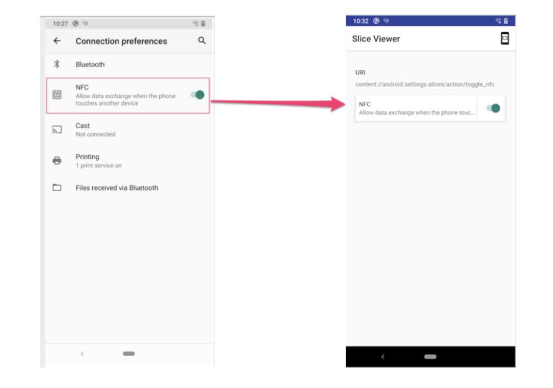 简言之,Slice就是可分享的UI界面,包括图标、文本和动作(SliceAction),Slice通过URI来唯一标识。例如Settings中打开NFC开关的这个界面,就可以通过SettingsSliceProvider中