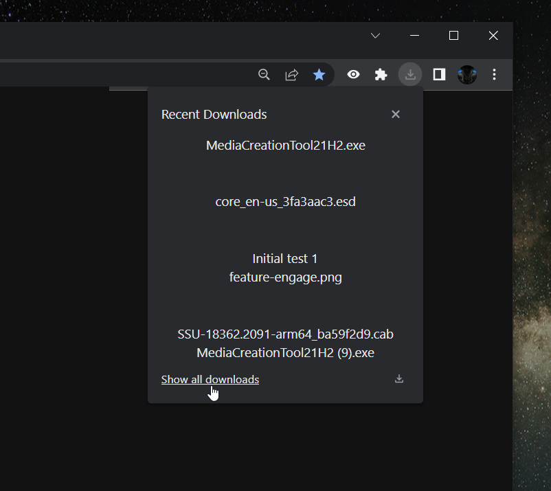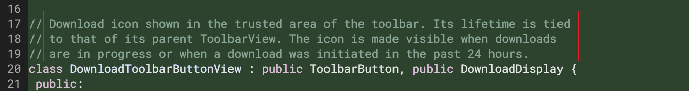 从其源代码的注释来看,只有开始下载新文件或过去24小时执行过下载任务的时候,该下载按钮才会显示(微软 Edge 的下载按钮也是这样,不过 Edge 可以通过设置让下载按钮常驻在工具栏上,不知道谷歌会不会添加这个设置选项)。此外,点击下载按钮不会显示所有下载历史记录,只会显示正在进行的下载(可能还有近期的下载)。