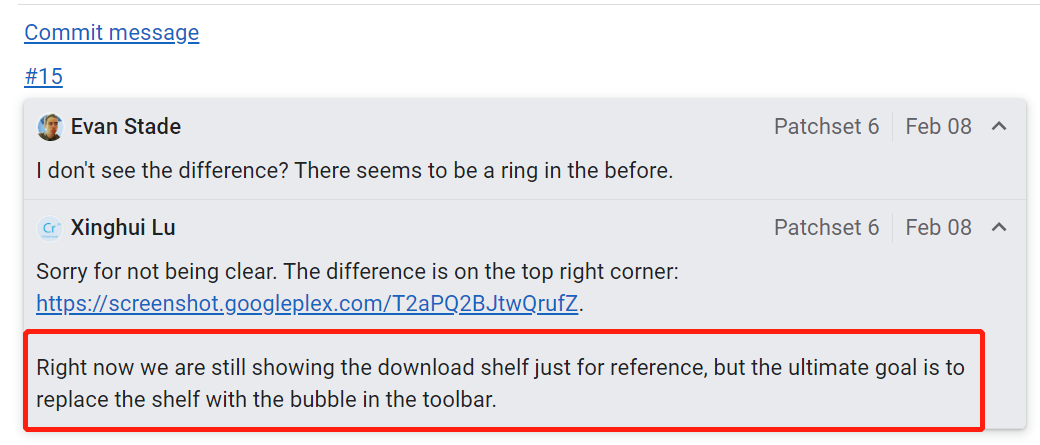 此外,曾一些网友认为,或许这个下载按钮只是对 Chrome 底部下载框的一种补充。事实上,在环形进度条的补丁讨论中,开发者 Xinghui Lu 明确表示: