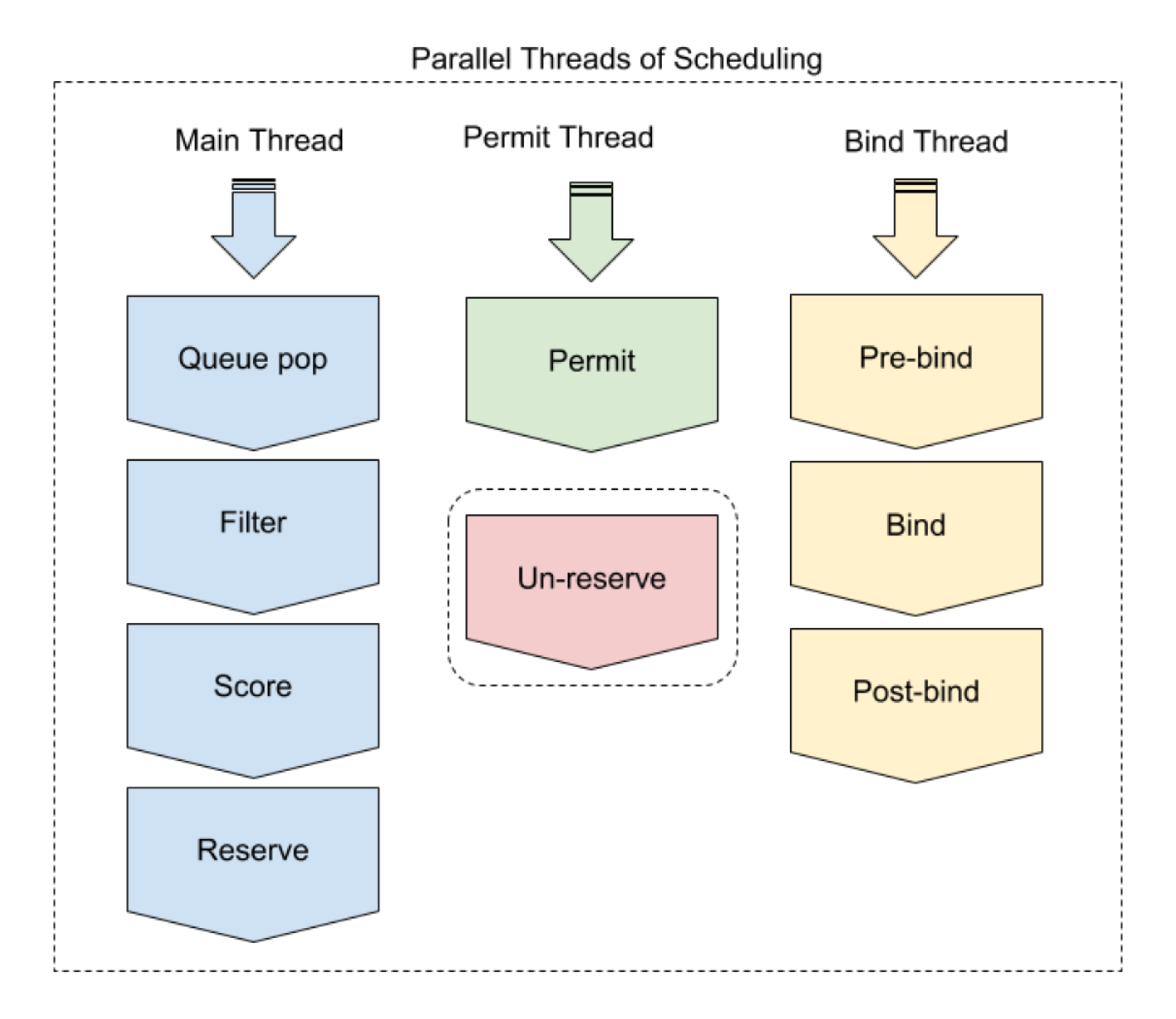 最后,可以从主线程或绑定线程调用 Reserve 插件中的 Unreserve 方法,具体取决于 pod 被拒绝的方式。