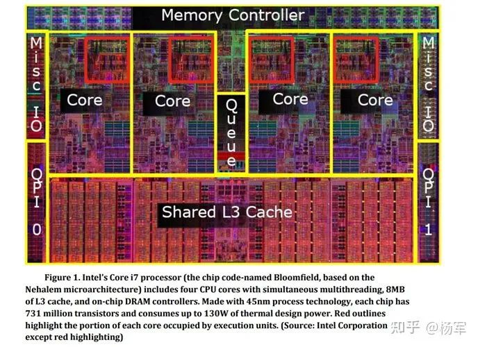 需要指出的是,上面的对比,并没有做到完全基于第一性原理的公平性,比如Intel Core i7-920的工艺是45nm,而GTX580是40nm,集成的晶体管数量也存在明显的差异(30B v.s. 0.731B)。不过考虑到i7-920的架构设计中,只有不到20%的芯片面积用于实际计算,(参见下图:https://www.nvidia.com/content/PDF/fermi_white_papers/P.Glaskowsky_NVIDIA%27s_Fermi-The_First_Complete_GPU_Architecture.pdf),已经可以认为,论文里的性能差异是由GPU和CPU在架构设计权衡的定性差异所带来的,所以我们不再花费精力进行更精细的定量对比。