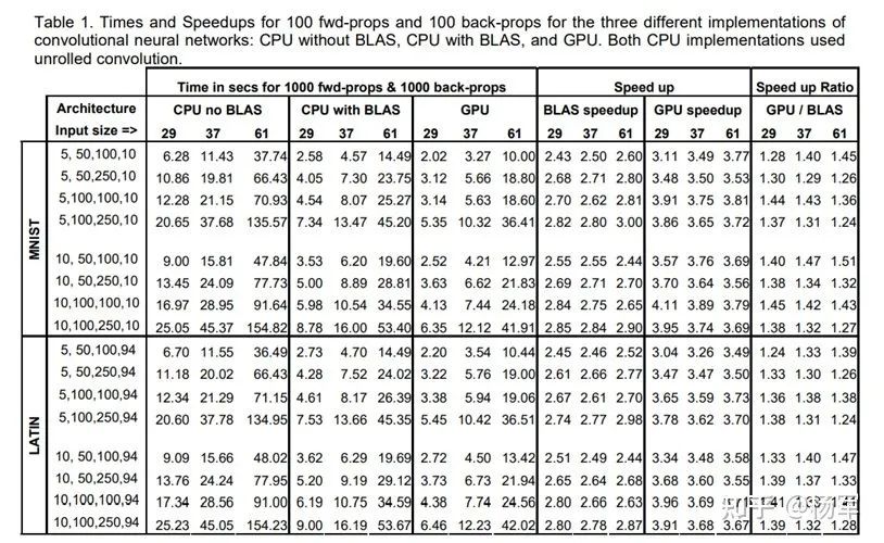而在2011年的这篇文章( https://people.idsia.ch/~juergen/ijcai2011.pdf )里,基于CUDA实现的卷积操作,性能最多已经达到了Intel CPU上的60倍。当时使用的硬件是Intel Core i7-920(2.66GHZ)以及基于Fermi架构的GTX480/GTX580显卡。年代久远,实测评估已经不太现实,不过,从多个途径的数据cross check的结果( https://gadgetversus.com/processor/intel-core-i7-920-specs/, https://fiehnlab.ucdavis.edu/staff/kind/collector/benchmark/core-i7-vs-opteron, 还有https://www.overclock.net/threads/intel-and-amd-gflops-data-thread-looking-for-sandybridge-too.869018/ )来看,i7-920 2.66GHZ的峰值算力大体在在24~100GFlops之间。关于i7-920的理论峰值算力, @李少侠 给出了一个比较专业的预估,我直接援引如下: