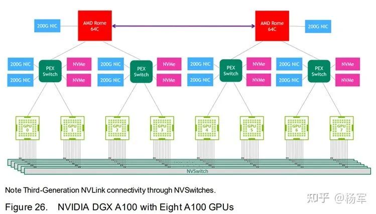 NVSwitch。在NVLink的基础上,2018年NV基于NVSwitch推出了DGX-2机型。NVSwitch的出现使得单机内部卡间通信带宽呈现出了均匀性。单机八卡机型,每块GPU通过6根links连接到NVSwitch上,再通过NVSwitch和其他GPU进行互联。所以理论上,任意两块GPU之间,都可以达到最高达300GB/s的双向带宽。这就为reduce-to-one乃至all2all这种通信模式提供了极大便利性。