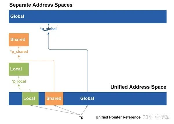 load/store地址位宽由32-bit提升到64-bit,为统一地址访问提供了基础条件。比如local memory,shared memory,global memory进行统一编址(参见下面的一张示意图)。