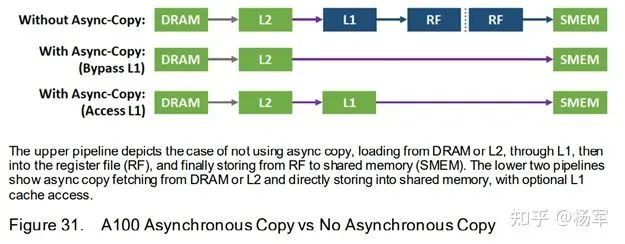 引入了用于异步数据copy的LDGSTS指令,可以bypass寄存器的中转,直接从global memory里将数据加载到shared memory,减少了寄存器的压力和不必要的数据中转,进一步节省了功耗。并且因为这条指令的异步性,可以作为背景操作和前台的计算指令overlap执行,进一步提升整体计算效率。