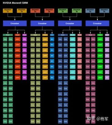 对warp scheduler的设计进行了调整(https://www.anandtech.com/show/7764/the-nvidia-geforce-gtx-750-ti-and-gtx-750-review-maxwell/3),每个warp scheduler只能看到SM内部四分之一的计算执行资源,牺牲了一定的灵活度,但节省了全局warp scheduling所需的SM范围内全局crossbar的功耗开销。
