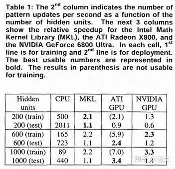 有趣的是在,这篇文章的脚注里提到了除了在NVIDIA GeForce 7800 Ultra( https://www.techpowerup.com/gpu-specs/geforce-7800-gtx.c127 ),Intel Pentium 4( https://en.wikipedia.org/wiki/Pentium_4 )上的性能实验之外,也准备加入ATI Radeon X1900( https://www.techpowerup.com/gpu-specs/radeon-x1900-xt.c454 )上的实验结果。在2005年更早的一篇文章( https://ieeexplore.ieee.org/stamp/stamp.jsp?tp=&arnumber=1575717 )里,能够看到在CPU, ATI GPU, NV GPU上同时进行MLP加速实验对比的一些数据,看起来当时还互有千秋。