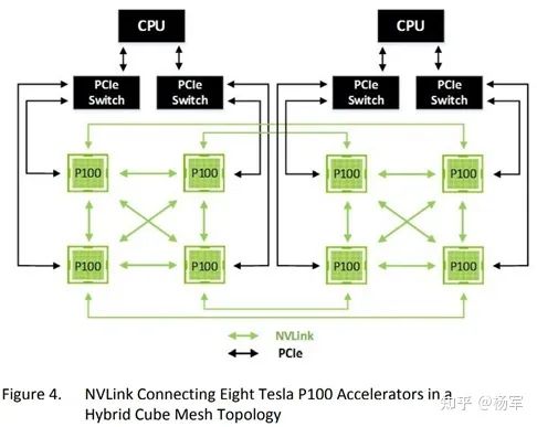 2. NVLink。在我的认知里,NVLink是一个典型的点状头部业务驱动技术架构升级,技术架构升级进一步影响更多业务接受的技术特性。NVLink背后的含义是单机多卡,并且只有卡多到一定程度以后,NVLink的价值才更容易显现。所以在Pascal的whitepaper( https://images.nvidia.com/content/pdf/tesla/whitepaper/pascal-architecture-whitepaper.pdf )里给出的参考架构至少也是单机四卡的规模,标配是单机八卡。而单机四卡/八卡被生产环境接纳,并不像现在感觉这么显然。原因主要是几点: