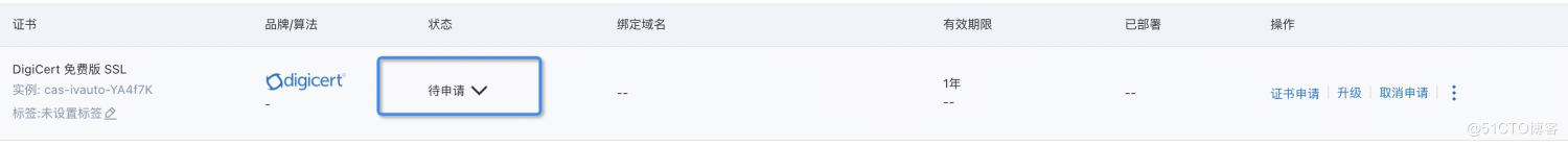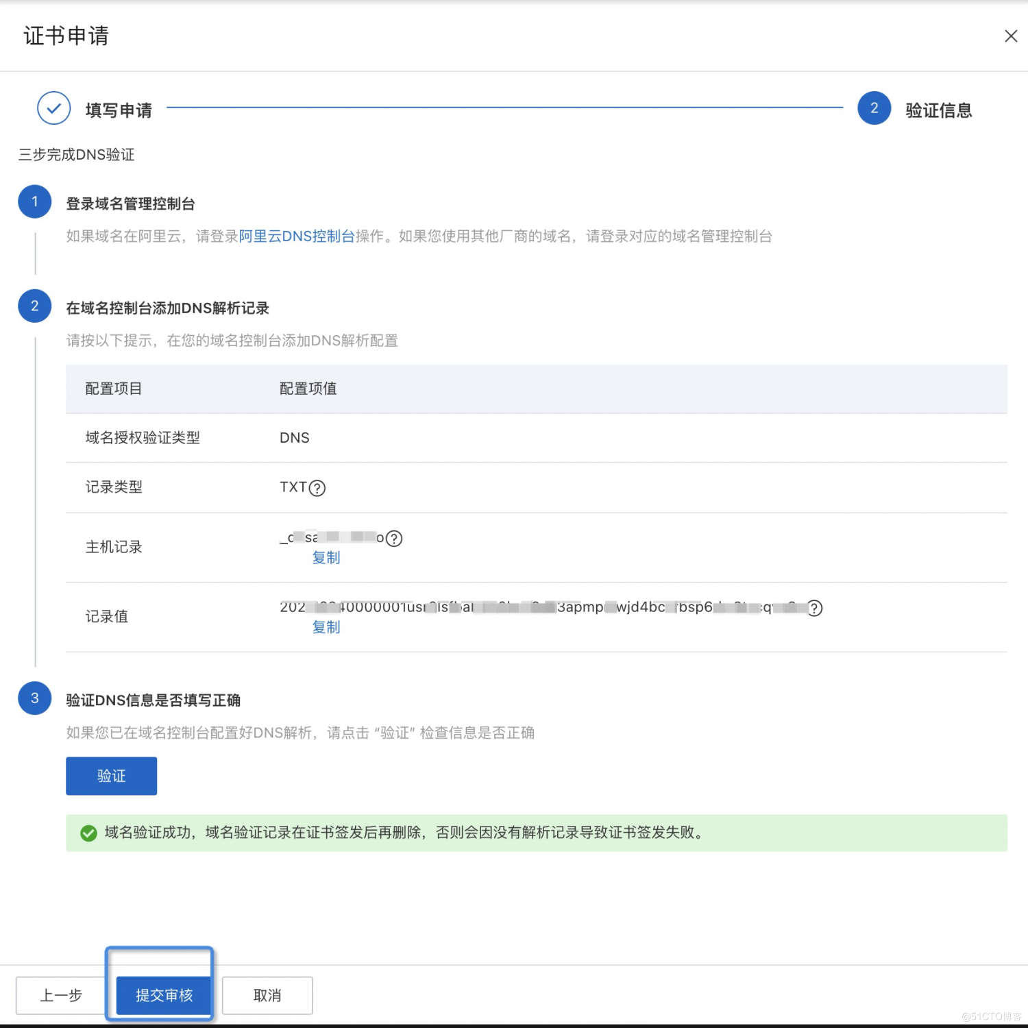 点击右侧的“证书申请”将你的信息和域名填写上去,然后进行验证,通过后“提交审核”: