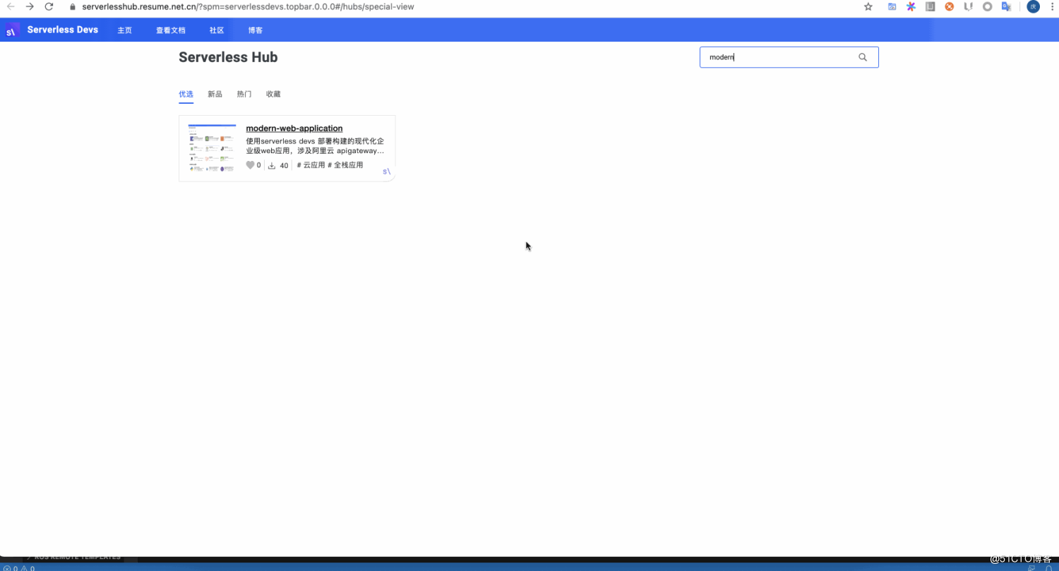 秘钥配置好,为了更便捷地检索相关应用模板,我们可以登录 serverless devs 应用中心, 搜索 "modern-web-application",然后根据下图所示操作即可。