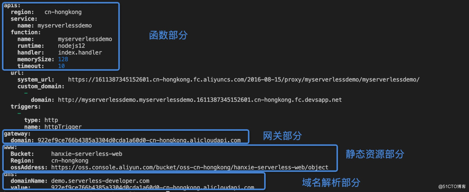 当我们部署好之后,我们可以查看一下网关,OSS, 函数计算,以及 DNS 是否已经部署完成我们所需要的内容。