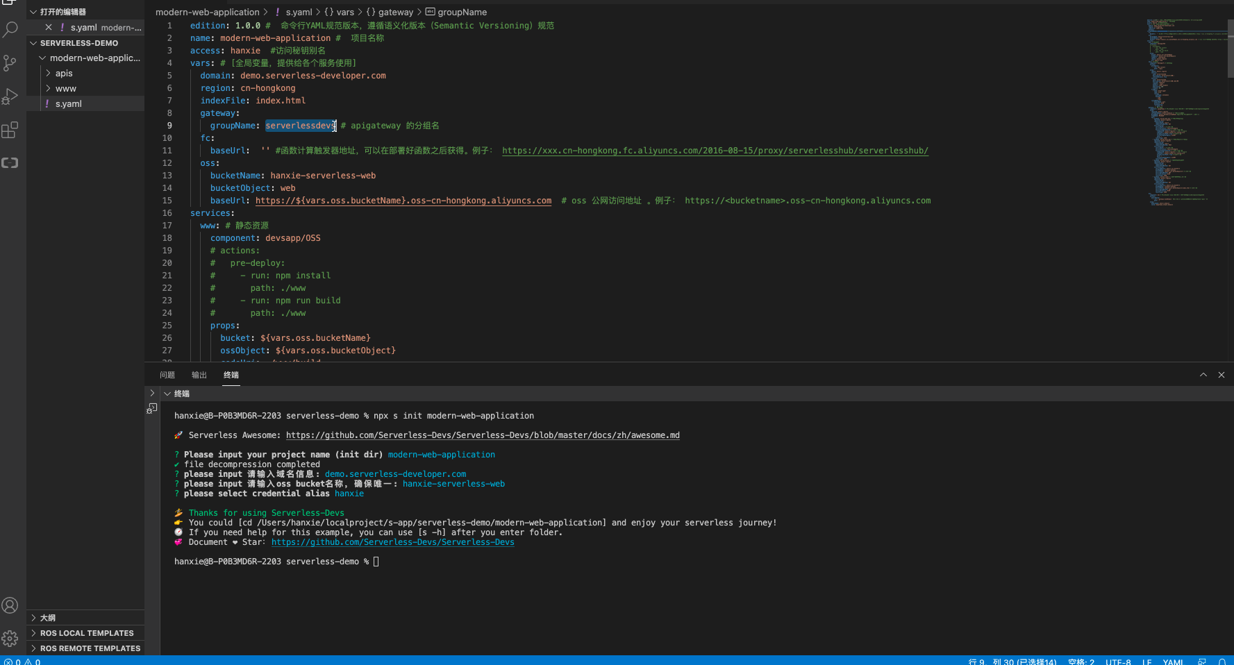 3.根据引导提示输入提前准备好的域名( 如 demo.serverless-developer.com ) 以及oss bucket 名称( hanxie-serverless-web ) 建议 oss bucket 提前在控制台创建