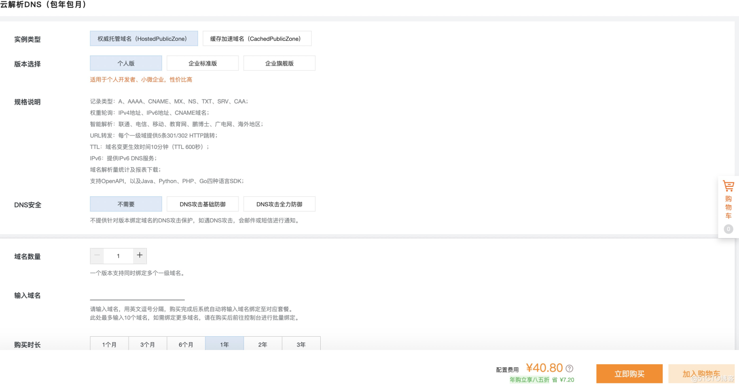 (另外说一下 DNS 的域名解析是要花钱的,个人版的话第一个域名大约 40.8块/年,此外每增加一个需额外另加20块钱左右。)