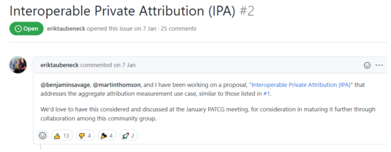 基于此种情况,Mozilla 联合 Meta 向私人广告技术社区小组(PATCG,互联网标准 W3C 中的一个小组,专门为在不损害隐私的情况下改进广告) 提出了 IPA 提案, IPA 技术旨在为广告商提供分析、操作归因的能力,同时提供强大的用户隐私保护。