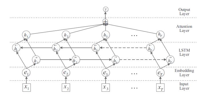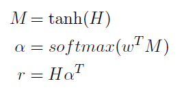 其中,H \in R^{d^\omega\times T}H∈Rdω×T是BiLSTM的输出, d^\omegadω 是隐层维度,TT 是句子长度, \omegaω 、 \alphaα 、rr的维度分别为 d^\omegadω 、TT、d^\omegadω。最后使用特征向量rr进行关系分类。