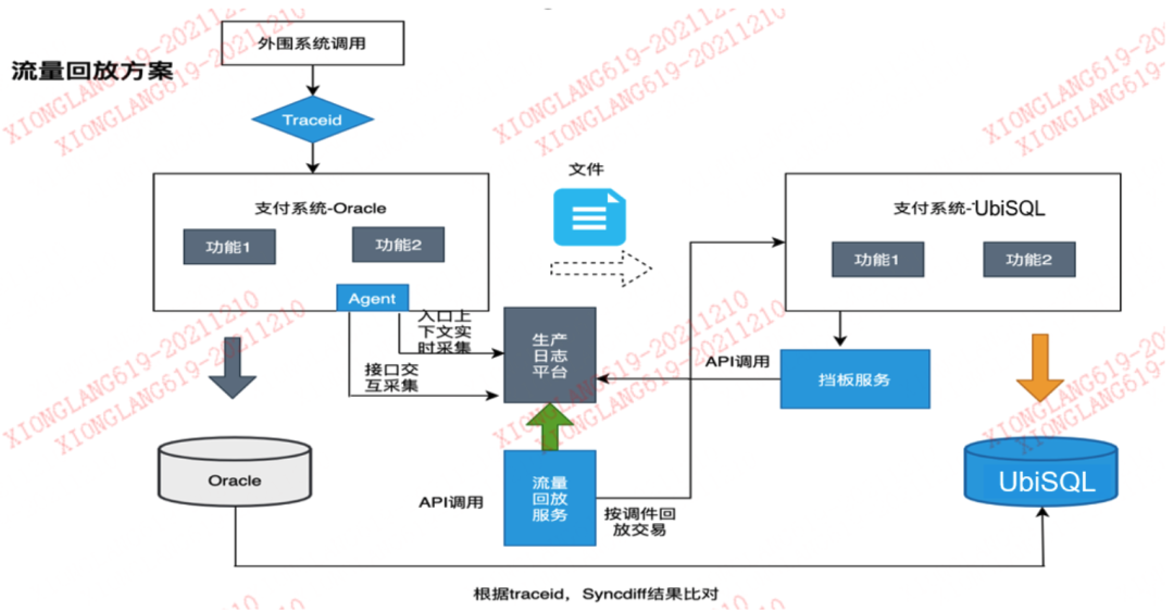 图:流量回放方案 流量回放相对比较复杂,主要是开发同学实现的。主要的实现逻辑,就是通过外围系统的调用,通过 Traceid 访问相应的功能点,功能点上面会有一个 Agent,会去把相应调用的情况和参数,调用到哪个接口记录下来,存储到日志平台上。再通过日志平台里面的存储,将这部分存储下来,存储后调用后续支付系统的 UbiSQL,就可以做到数据的回放。