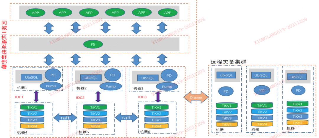 图:迁移前后集群的对比 UbiSQL 的架构是通过 F5 负载均衡,打到三个数据中心的 TiDB 集群上面,F5 在三地机房都有部署,通过 DNS 方式访问相应 UbiSQL 的实例,在机房 IDC1、IDC2、IDC3 的集群之间通过 UbiSQL 自身的 Raft 协议实现强一致的数据同步,再通过 Drainer 工具进行异步复制,复制到远程的灾备集群。