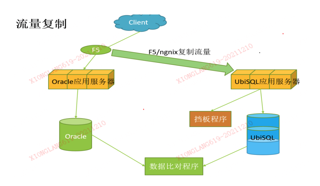 图:流量复制 流量复制借助的是 F5,或者 Ngnix 的流量,将所有客户端的流量通过 F5 访问到 Oracle 的环境,也可以在 F5 这一层将流量做镜像,将实时到 F5 的流量转发到应用层,应用层通过访问 UbiSQL,再通过挡板程序做到相应业务的访问。整个环节的核心在 F5,所有的流量都要经过 F5,如果没有走 F5 的流量则没有办法抓取到相应 SQL 的调用或者执行。挡板程序则是将所有环境按照生产环境进行调用,如果访问其他数据库的话,不需要做相应的访问,在这个地方会有一个挡板程序。这个挡板程序就是直接访问其他数据库,直接获取结果,不在其他数据库执行,不然会出现数据混乱。