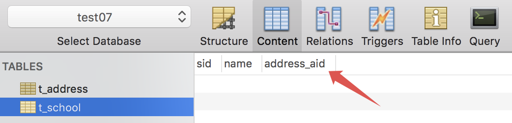 这样,最终创建出来的 t_school 表和 t_address 表中,会分别多出来一个字段 address_aid 和 school_sid,这两个字段都是外键,正是通过外键,将两张表中不同的记录关联起来。