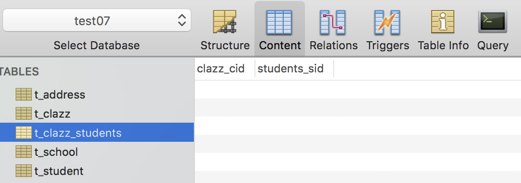 Clazz 和 Student 的关系是一对多,这个是通过一个自动生成的第三张表来实现的,如下: