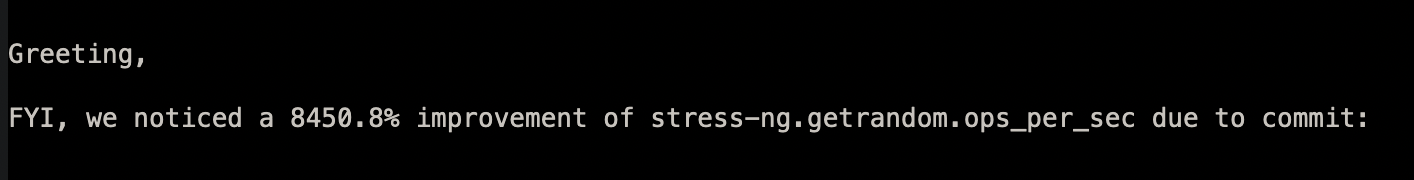 在邮件中特别强调到,通过使用正在开发的最新代码,用于获取随机字节的 getrandom() 调用能够获得更好的性能。在配备英特尔 Xeon E5-2697 v2 @ 2.70GHz CPU 和 112G 内存的设备上进行 stress-ng getrandom() 基准测试后,更是获得了 8450% 的性能提升。