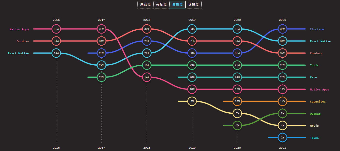 Electron 仍然是使用最广泛的工具,React Native 是第二大用于原生应用程序开发的工具。和其他领域一样,新兴技术 Tauri 和 Capacitor 的满意度依旧是最高的。使用率排名第三的 Cordova 最不受欢迎,满意度逐年下降至垫底。