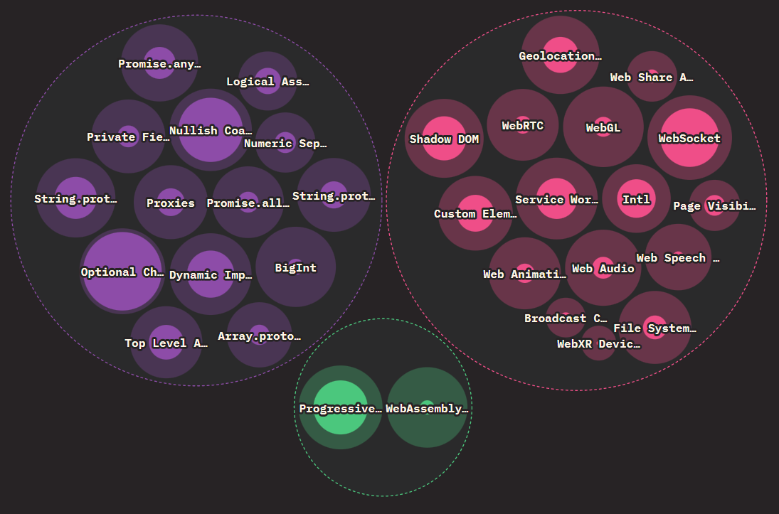 JavaScript 可能发展得很快,但 JavaScript 开发人员的发展速度貌似更快,因为许多相对较新的特性已经显示出了很高的采用率。报告把 JavaScript 的特性分成了语言、浏览器 API 和其他特性三个部分。下图根据分类划分,显示了各种特性的采用率;外圈的尺寸代表了了解这个特性的用户数量,内圈的尺寸代表了实际使用这个特性的用户数量。