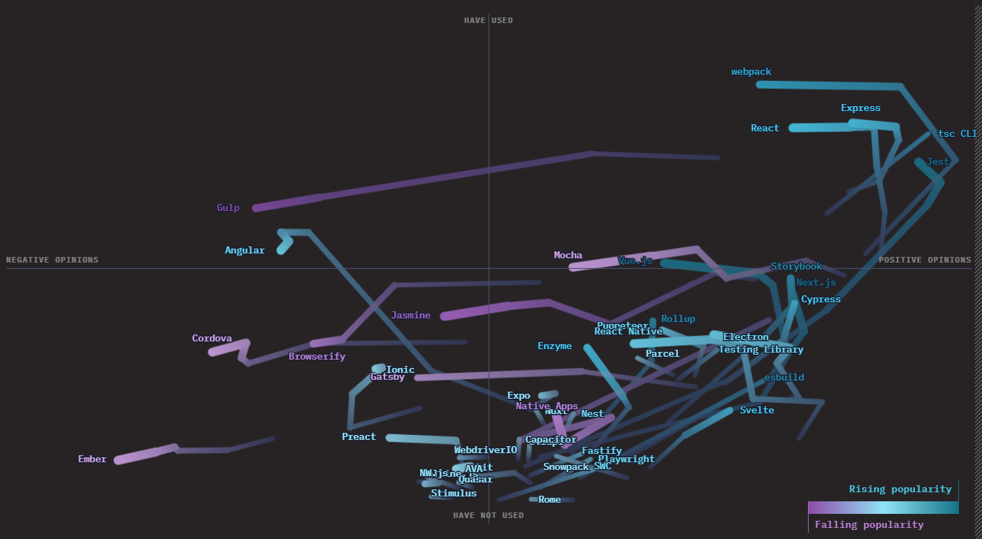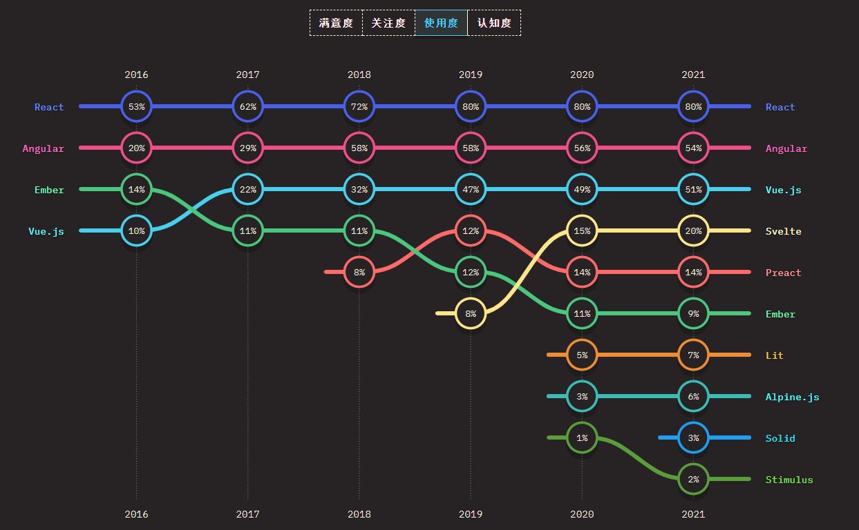 JavaScript 2021 大调查以象限图表示了 JavaScript 各技术这几年来的发展情况。每条线的使用时间从 2016 年到 2020 年。更高的分数意味着更多的人使用了这项技术;而右边的分数意味着更多的用户想要学习它,或已经使用过并且会再次使用它。