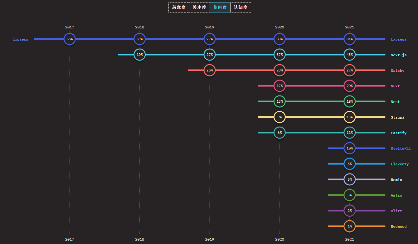后端框架领域基本无甚变化。Express 作为主流的后端框架依旧持续发力,Next.js 也在慢慢发展。满意度方面,新技术 SvelteKit、Astro 和 Fastify 以 90% 以上的分数领先,Gatsby 的满意度则在两年多的时间里从 89% 下降到了 51%。