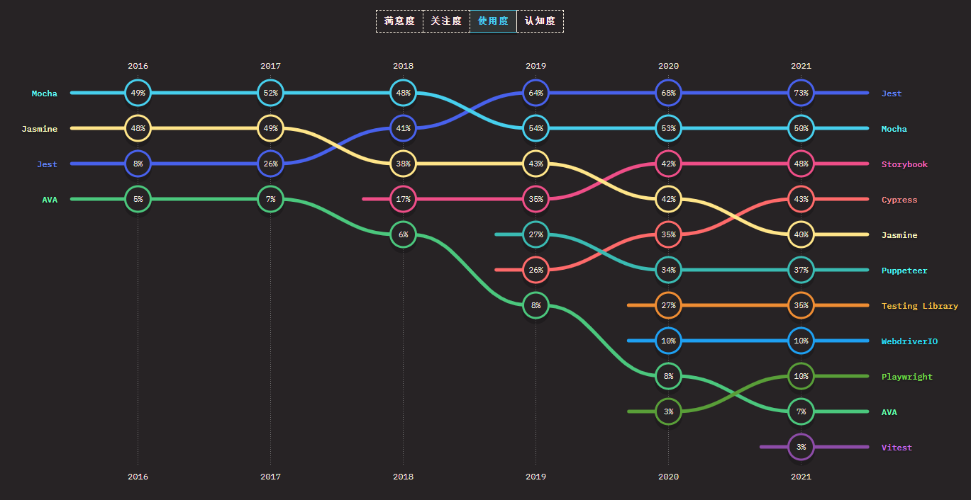 Jest 以 73% 的使用率蝉联最常用的单元测试框架榜首位置;但 Testing Library 和 Vitest 等新兴工具也不甘示弱,满意度分列榜一榜二。