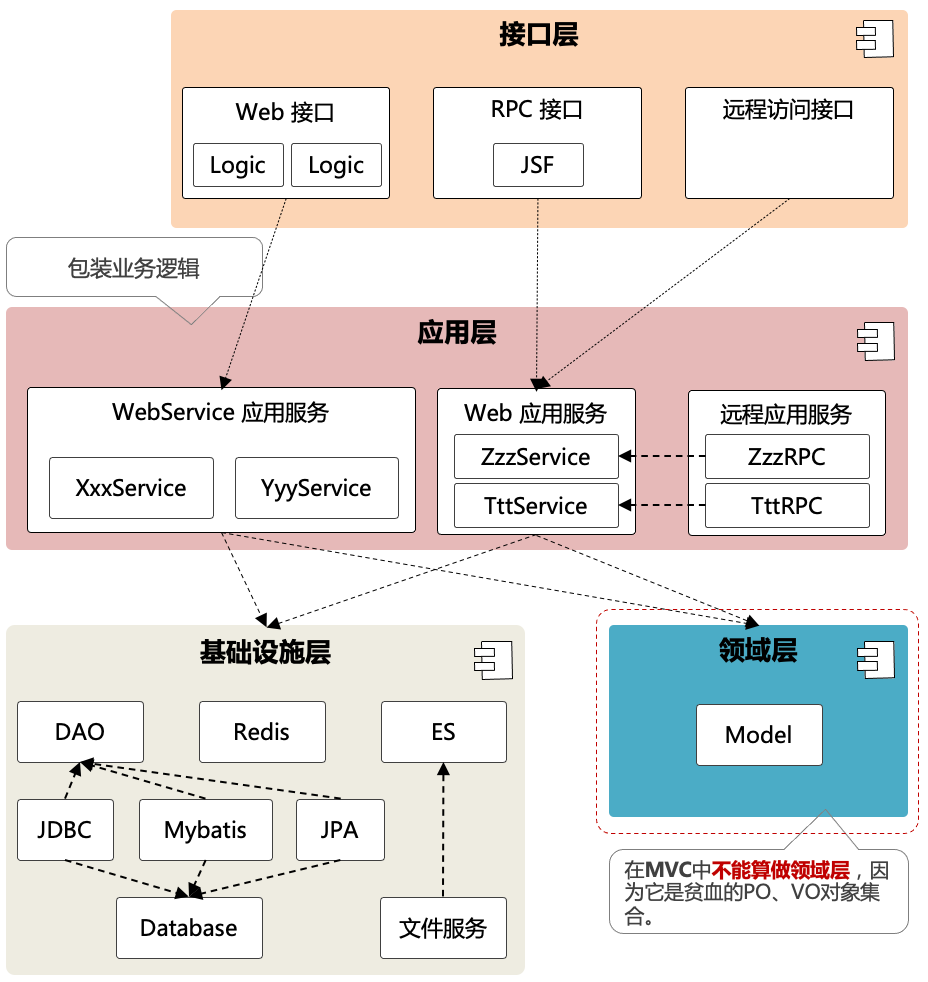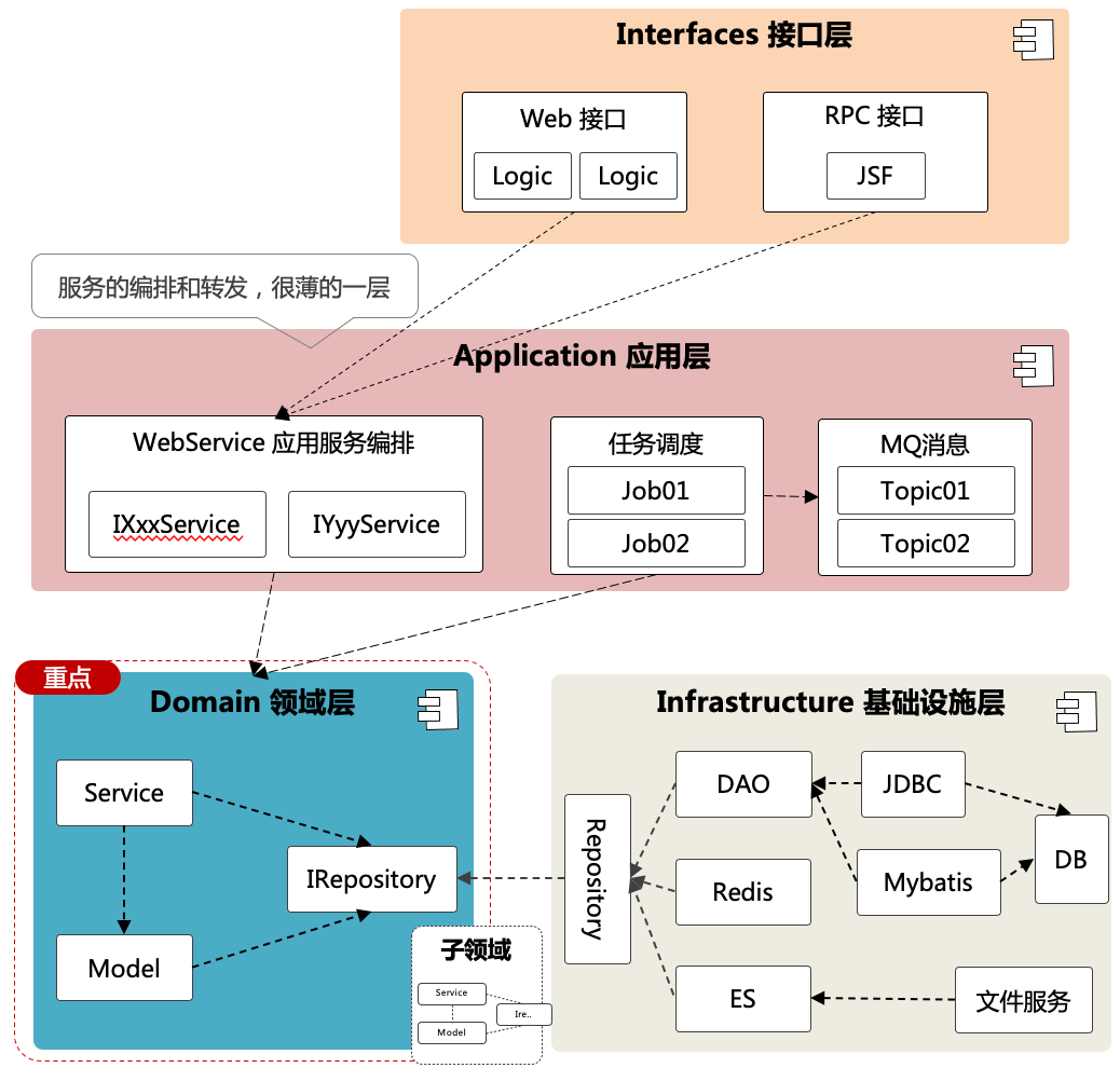 DDD 的分层结构更注重 Domain 领域层的实现,由很薄的应用层定义接口和编排接口,由领域层做具体的实现。 -