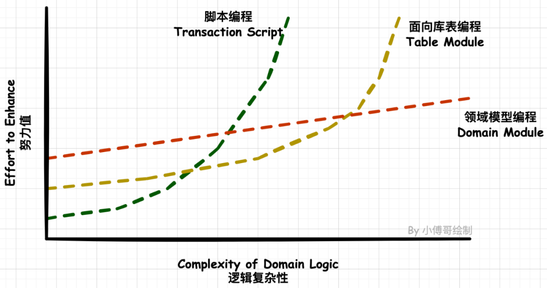 与其他两种分层结构相对比,使用 DDD 的时候,需要在前期投入较多的时间成本来设计领域建模,所以前期成本会更高一些。 -