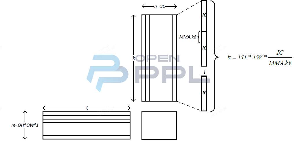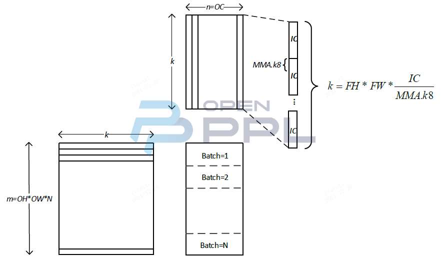 整个隐式矩阵乘卷积的算法流程如下图所示,其中,IH/IW/IC代表输入特征图的长,宽,通道,FH/FW代表卷积核的长和宽,OH/OW/OC代表输出特征图的长,宽,通道,Batch大小为N。X代表通道的数目,其含义可以参考TensorRT中提出的五维数据排布格式NCxHWX,将X个通道放在inner-most维度(X一般是mma指令k维度大小的倍数,如8/16/32/64等)。