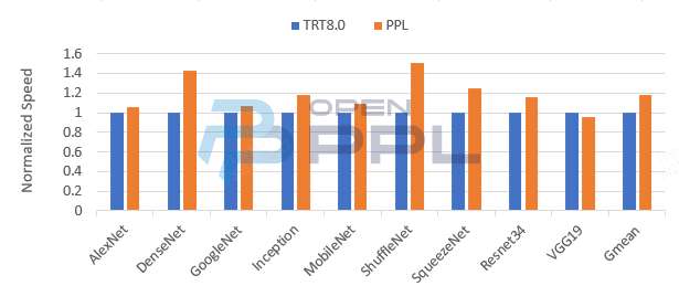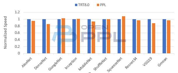 OpenPPL在batch=32的CV类公开网络上的模型推理性能如上图所示,达到了TensorRT的95%。通过nvprof进行性能对比,发现多batch的卷积性能略低于TensorRT,这与上图的模型性能结果相符。OpenPPL今后将继续提高多图多通道卷积类型的性能。
