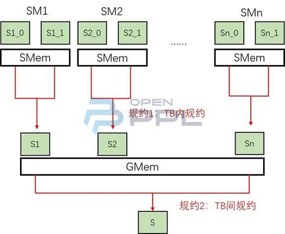 2SPK算法采用双层规约的方式,即采用SMem规约和GMem规约相结合的方式,对split的中间结果进行累加。如上图所示,第一级规约将线程块TB内的结果在SMem累加,输出中间结果到GMem上;第二级规约再执行单独的kernel,将GMem的中间结果累加,得到最后的结果。双层的规约方式结合了SMem规约与GMem规约的特点,提高了规约的效率。