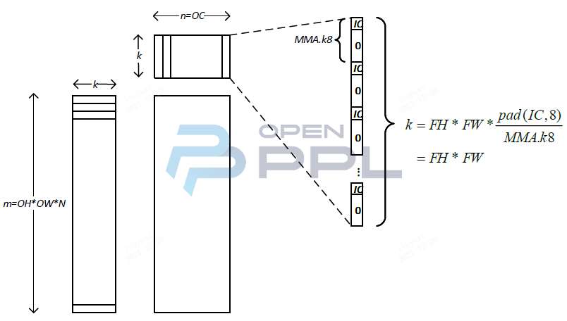 把大图少通道的卷积类型转换成矩阵乘后的尺寸如上图所示,m维度的尺寸很大,可以生成足够多的线程块来使用GPU的硬件资源;而k维度的尺寸却很小,甚至小于mma指令中MxNxK的K的大小。这里以Turing GPU上FP16精度的mma指令为例,其MxNxK的大小为16x8x8;当卷积核的通道数小于8时,就要在通道末尾填充0(即padding 0),使其达到8的倍数后才能发射到Tensor Core上执行。通道末尾填充的0越多,无效的冗余操作就越多,Tensor Core的利用率就越低。对于常见的3通道RGB输入卷积层,Tensor Core的利用率只有3/8。