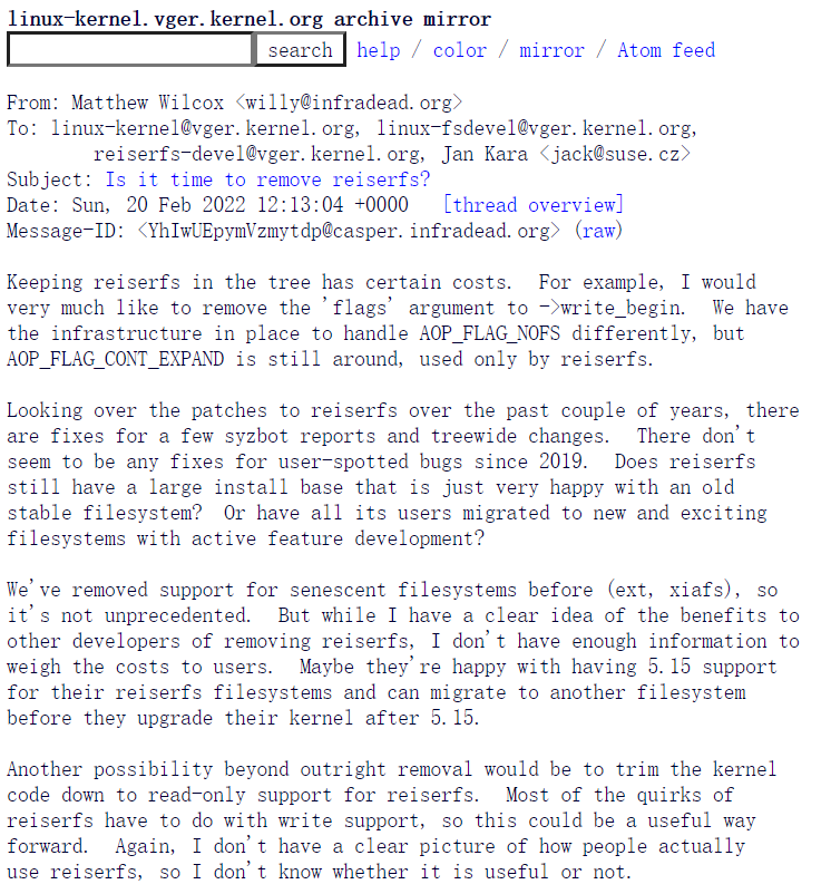 我们以前也删除过对老旧文件系统的支持(ext, xiafs),所以这并不是没有先例。不过,虽然我清楚地知道移除 reiserfs 对其他开发者的好处,但我没有足够的信息来衡量用户的成本。 也许他们对 5.15 支持他们的 reiserfs 文件系统感到满意,并且可以在 5.15 之后升级内核之前迁移到其他文件系统。