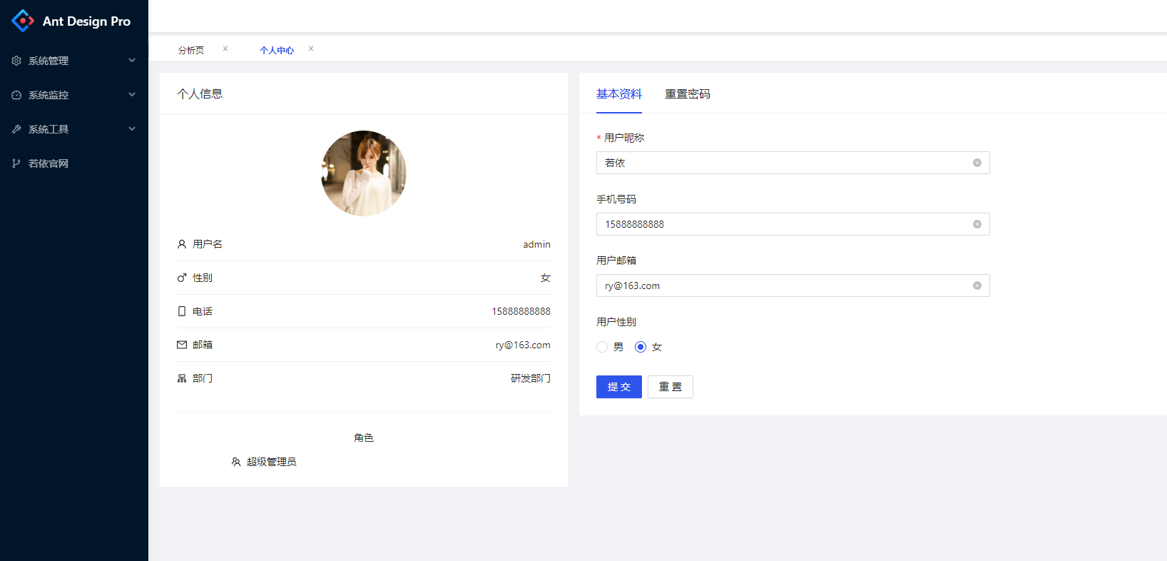 - 前端采用React 17、Ant Design Pro 5.0、TypeScript。