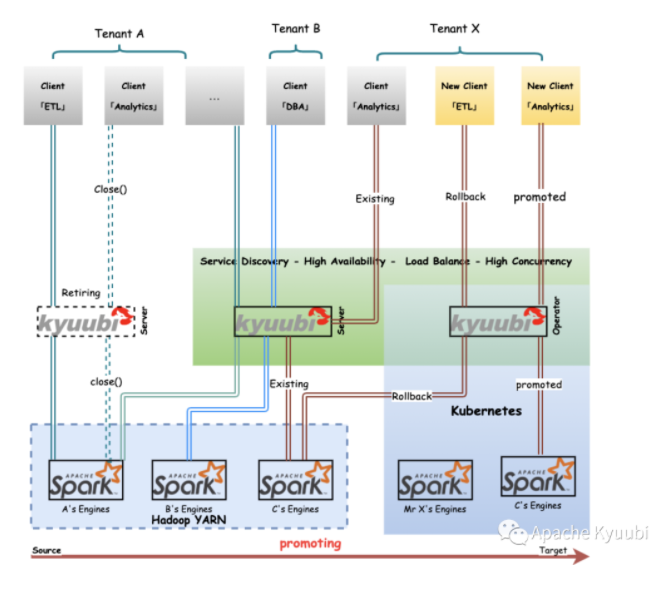 一般而言,大部分企业都会有很多离线的 Hive 或者 Spark 任务跑在 YARN 集群上,如何将大量的历史任务平滑地迁移到 Kubernetes 上也是让人头疼的问题。Kyuubi 的服务化方案,可以通过服务发现机制,提供负载均衡节点,在服务高可用的基础上,来平滑地过渡。对于个别异常迁移任务,我们也可以方便地 Rollback 到 老集群上保障执行,也留给我们定位问题的时间和空间。