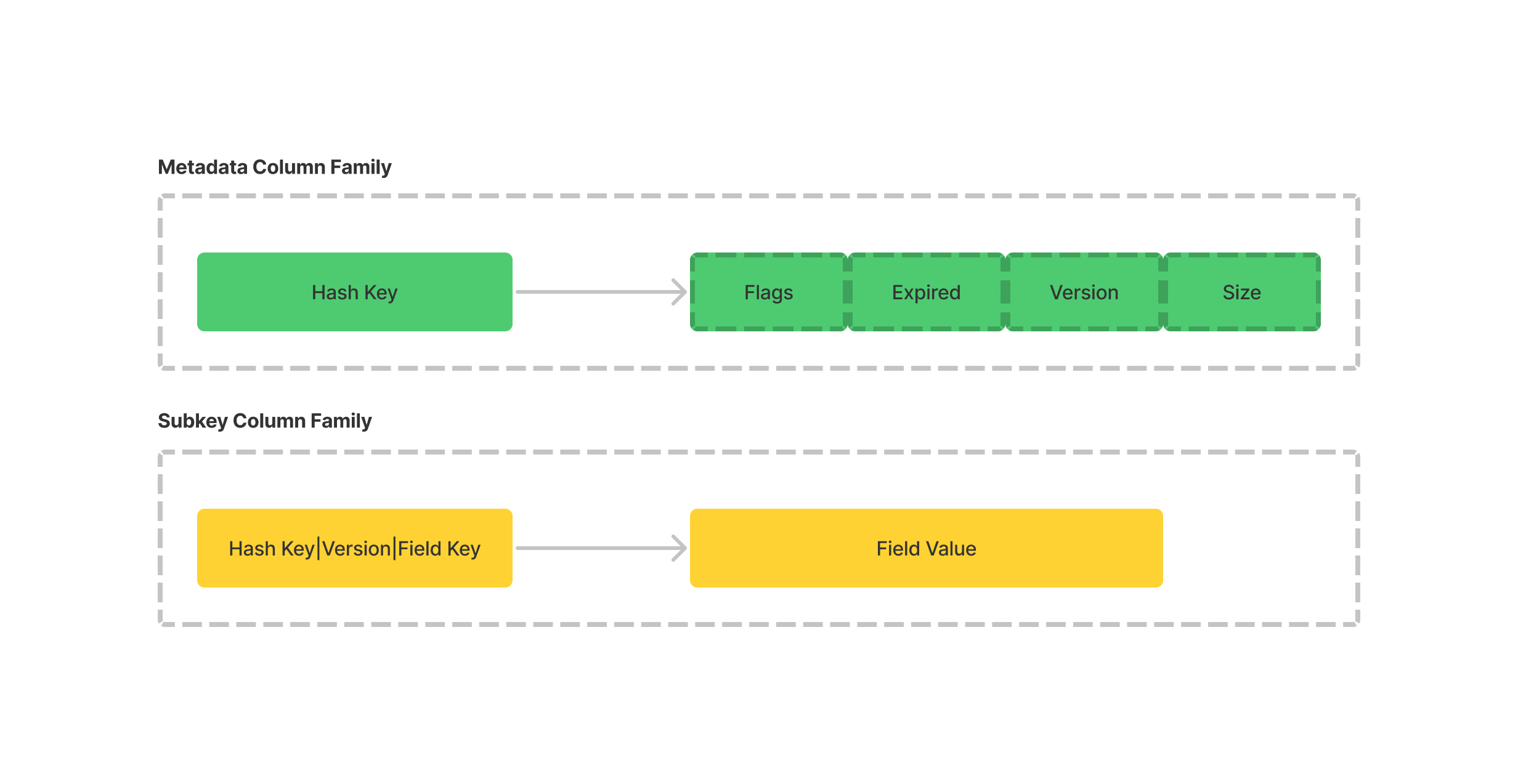 - Subkey Column Famliy, 用来存储 Hash 对应的子元素和对应的值,这个 Column Family 的 Key 组成是: Hash Key + 版本号 + 子字段的 Key,Value 是子元素对应的具体值