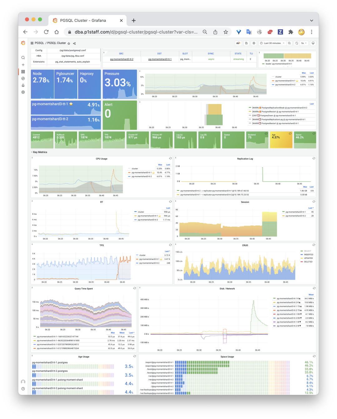 除了集群资源对象,PGSQL Cluster的首屏只呈现最关键的监控指标,报警事件,集群/实例压力水位。其他细节都隐藏在下面的专题栏中。