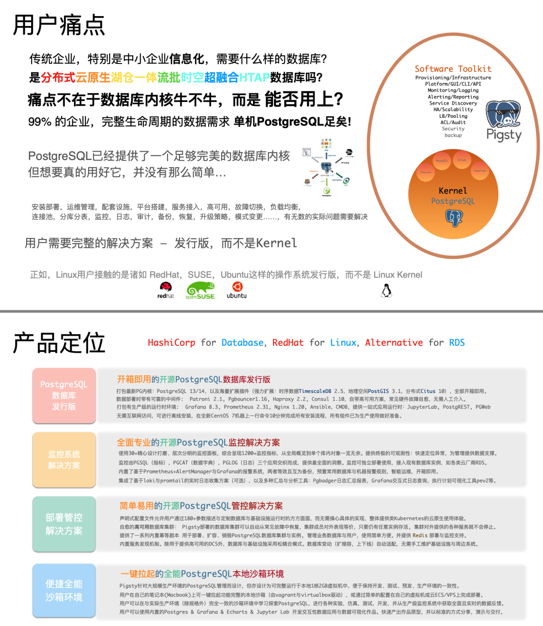 从长期来看,我希望在 Pigsty 中再添加 Minio,Kafka 支持,让整个产品形成一个以PostgreSQL为核心的整体解决方案,覆盖中小型企业完整生命周期的数据存储需求,打造一个开源的、私有的云数据库管控整体解决方案。关系型数据库PostgreSQL作为核心,缓存Redis强化TP能力,数仓Greenplum/MatrixDB强化大规模数据分析能力,对象存储Minio用于备份管理以及存储图像音视频等数据,消息队列Kafka提供数据总线的能力。通过完备的ETL/CDC支持将这些数据组件融为一体,实现turning the database inside-out!
