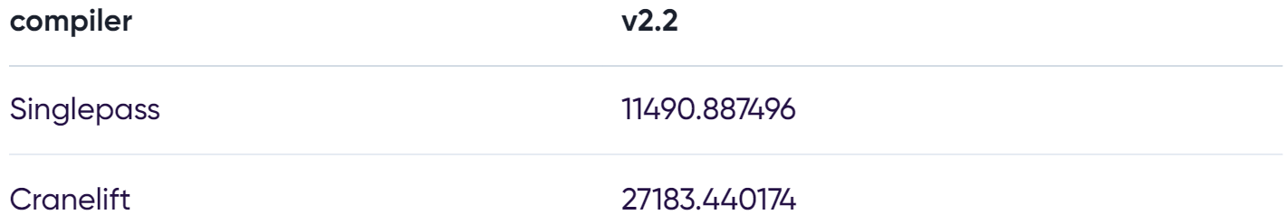 Singlepass 的另一个优点是可以避免 JIT “炸弹”。对于使用较旧 Intel/AMD CPU 的用户,Wasmer 2.2 中的 Singlepass 编译器还添加了 SSE 4.2 支持作为其 AVX 路径的替代方案。