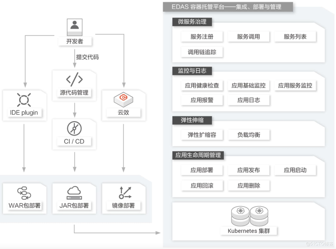 在 EDAS 平台中,用户可以通过 WAR 包、JAR 包或镜像等多种方式快速部署应用到多种底层服务器集群,免集群维护,能够轻松部署应用的基线版本和灰度版本。EDAS 无缝接入了 MSE 微服务治理能力,部署在 EDAS 的应用无需额外安装 Agent 即可零代码入侵获得应用无损上下线、金丝雀发布、全链路流量控制等高级特性。