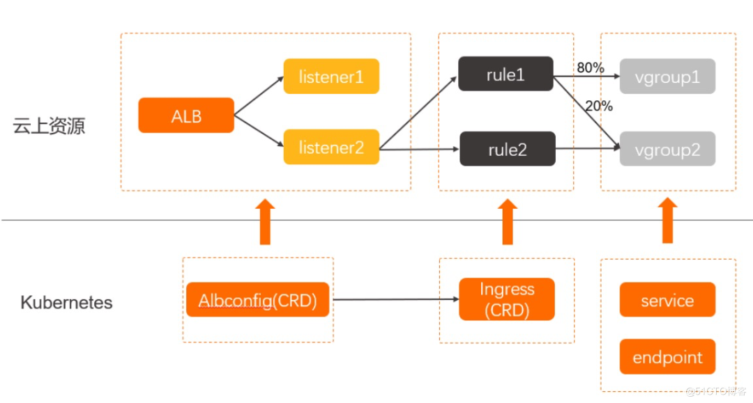 ALB Ingress Controller 通过 API Server 获取 Ingress 资源的变化,动态地生成AlbConfig,然后依次创建 ALB 实例、监听、路由转发规则以及后端服务器组。Kubernetes 中 Service、Ingress 与 AlbConfig 有着以下关系: