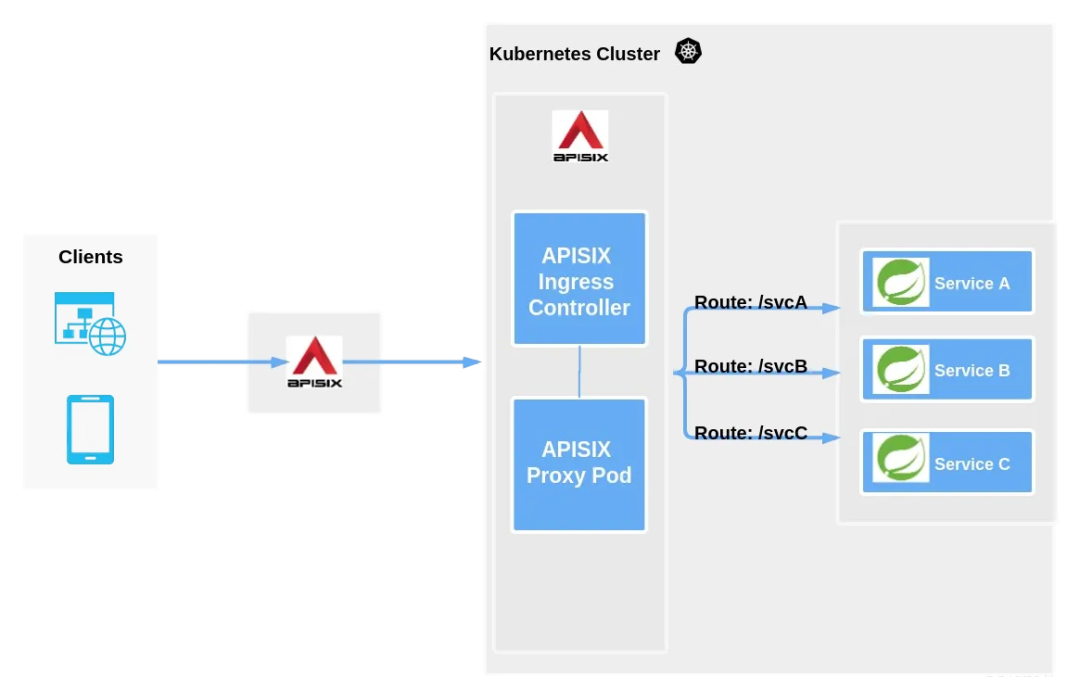 从上图可以看到,APISIX Ingress 分成了两部分。一部分是 APISIX Ingress Controller,作为控制面它将完成配置管理与分发。另一部分 APISIX Proxy Pod 负责承载业务流量,它是通过 CRD(Custom Resource Definitions) 的方式实现的。Apache APISIX Ingress 除了支持自定义资源外,还支持原生的 Kubernetes Ingress 资源。